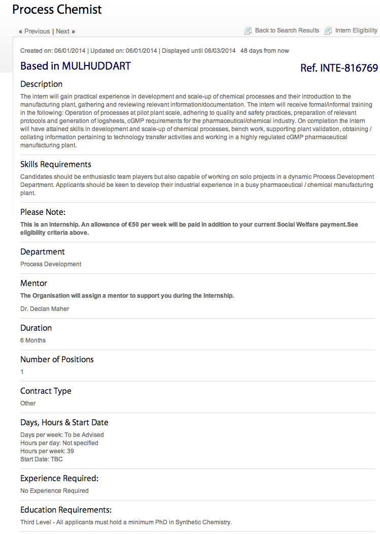 Leanna Byrne | Editor The national internship scheme, JobsBridge, are allowing companies to advertise for positions looking for candidates with a “minimum” of a PhD, The University Times have learned. A tweet was sent to The University Times twitter account at 2:37pm this afternoon with the advertisement that was placed by ClaroChem Ireland Ltd. The ad was created on 6th January on jobsireland.ie.ADVERTISEMENT Clarochem Ireland Ltd is an APIs manufacturing plant, located in Damastown. The company say they are looking for an intern that will work as a Process Chemist. This intern will gain “practical experience in development and scale-up of chemical processes and their … Continue reading JobsBridge Internship Seeking PhD Qualifications