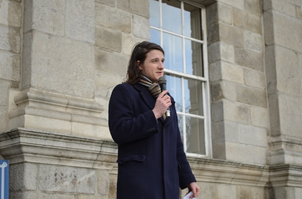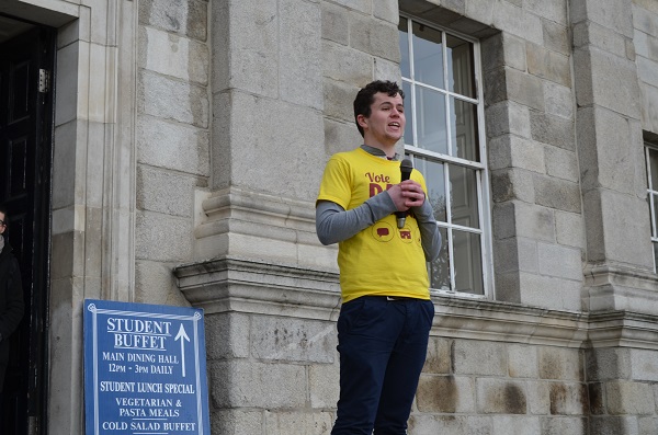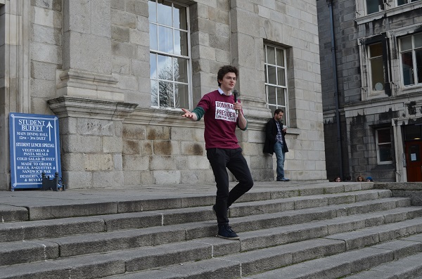 The key event of the day was the Hustings on the steps of the Dining Hall. This offered an opportunity for Dan to outline further a significant aspect of his campaign, the TCDSU Landlord Database. He said he would “personally recruit” landlords to help ease the yearly accommodation crisis facing students. As someone currently “homeless and sleeping on a couch with these eejits [his supporters below]”, he said he understood the anxiety felt by many students in their search for accommodation.